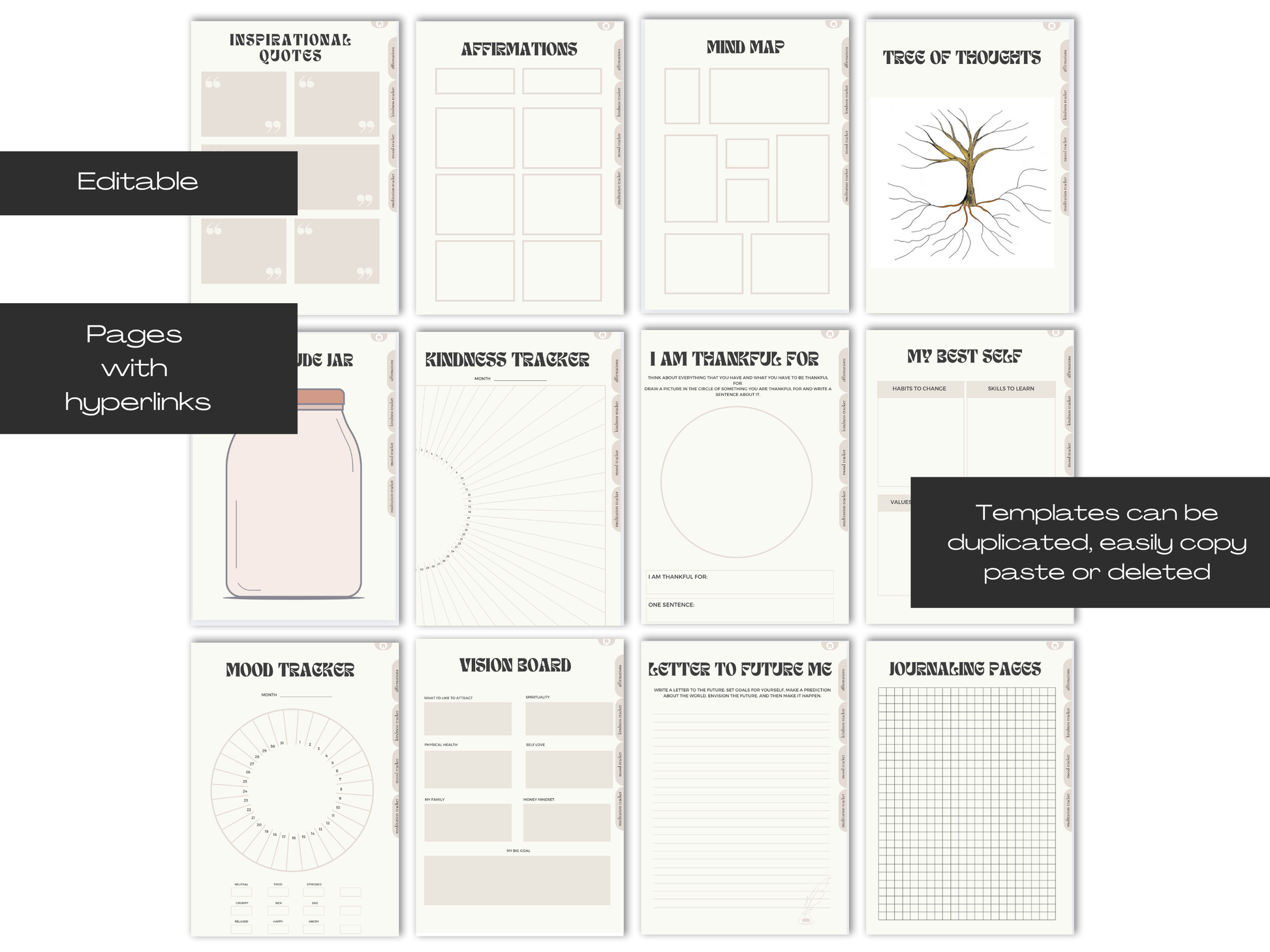 Unlock your potential and bring your dreams to life with our revolutionary Vision Board Digital Journal! Our meticulously designed 33-page planner is a powerhouse of tools and resources aimed at fueling your journey towards turning aspirations into reality. Packed with features like Inspirational Quotes, Affirmations, Mind Maps, Tree of Thoughts, Expressing Gratitude, Gratitude Jar, Kindness Tracker, and many more, every page is thoughtfully curated to spark motivation, foster optimistic outlooks, and lead you towards triumph. Embrace the power of visualization, positive affirmations, and structured goal-setting as you embark on a fulfilling path to success. Embrace our Vision Board Digital Journal and watch as your dreams unfold before your eyes.